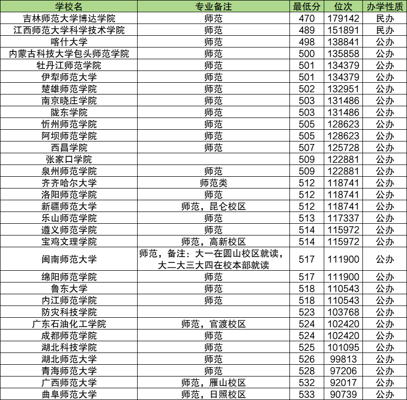 在理科二本招生的地理科学大学有32所,录取分数线最低的是吉林师范大学博达学院(民办),2024年最低分470分;录取分数线最高的是曲阜师范大学,2024年最低分533分。最低分公办二本地理科学大学为喀什大学,2024年最低分498分。