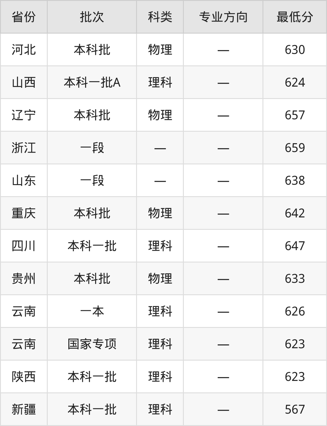 四川大学物理学类专业录取分数线从567分到659分不等,在部分地区的最低分数线如下: