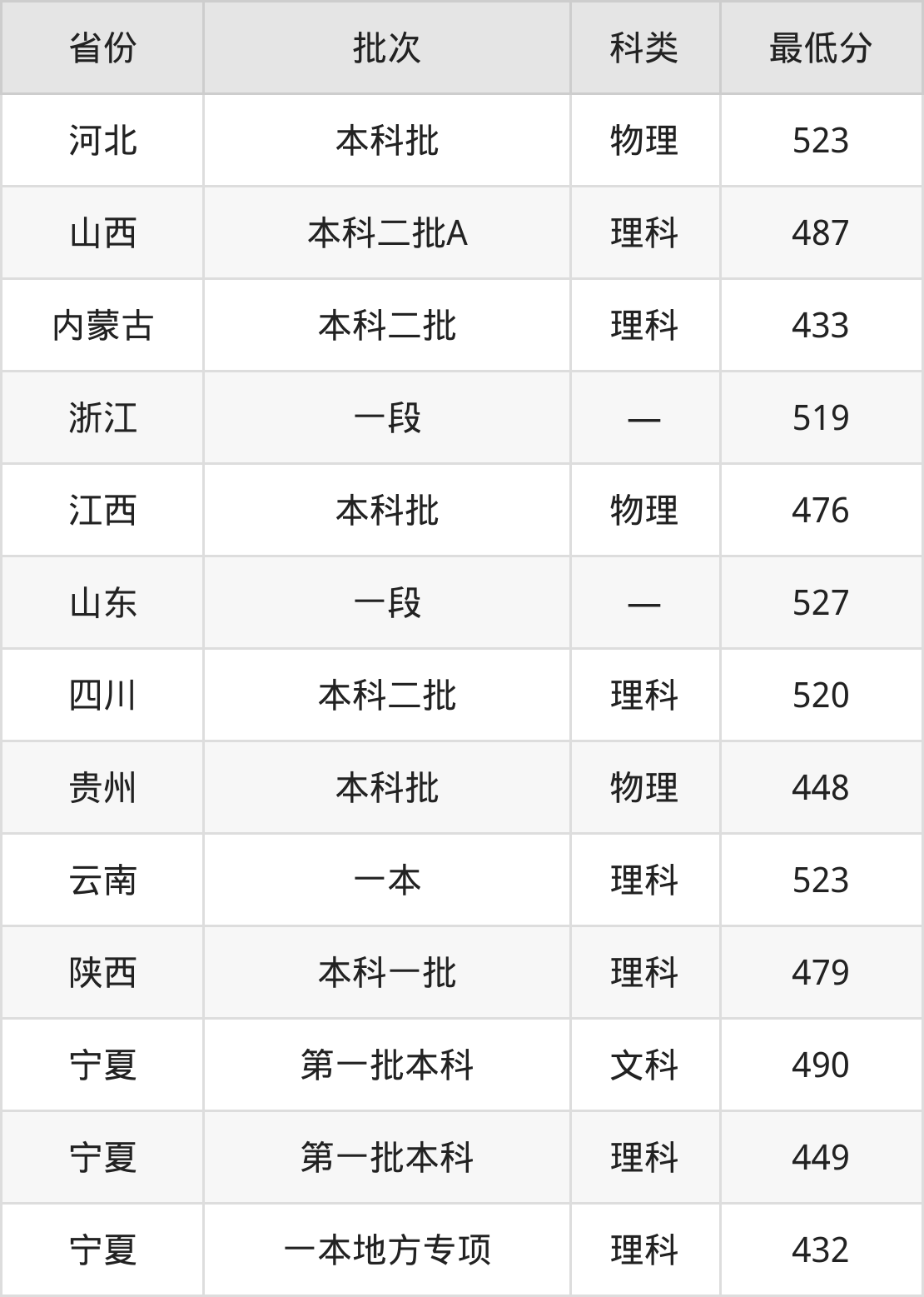 宁夏医科大学护理学专业录取分数线从432分到527分不等,在部分地区的最低分数线如下: