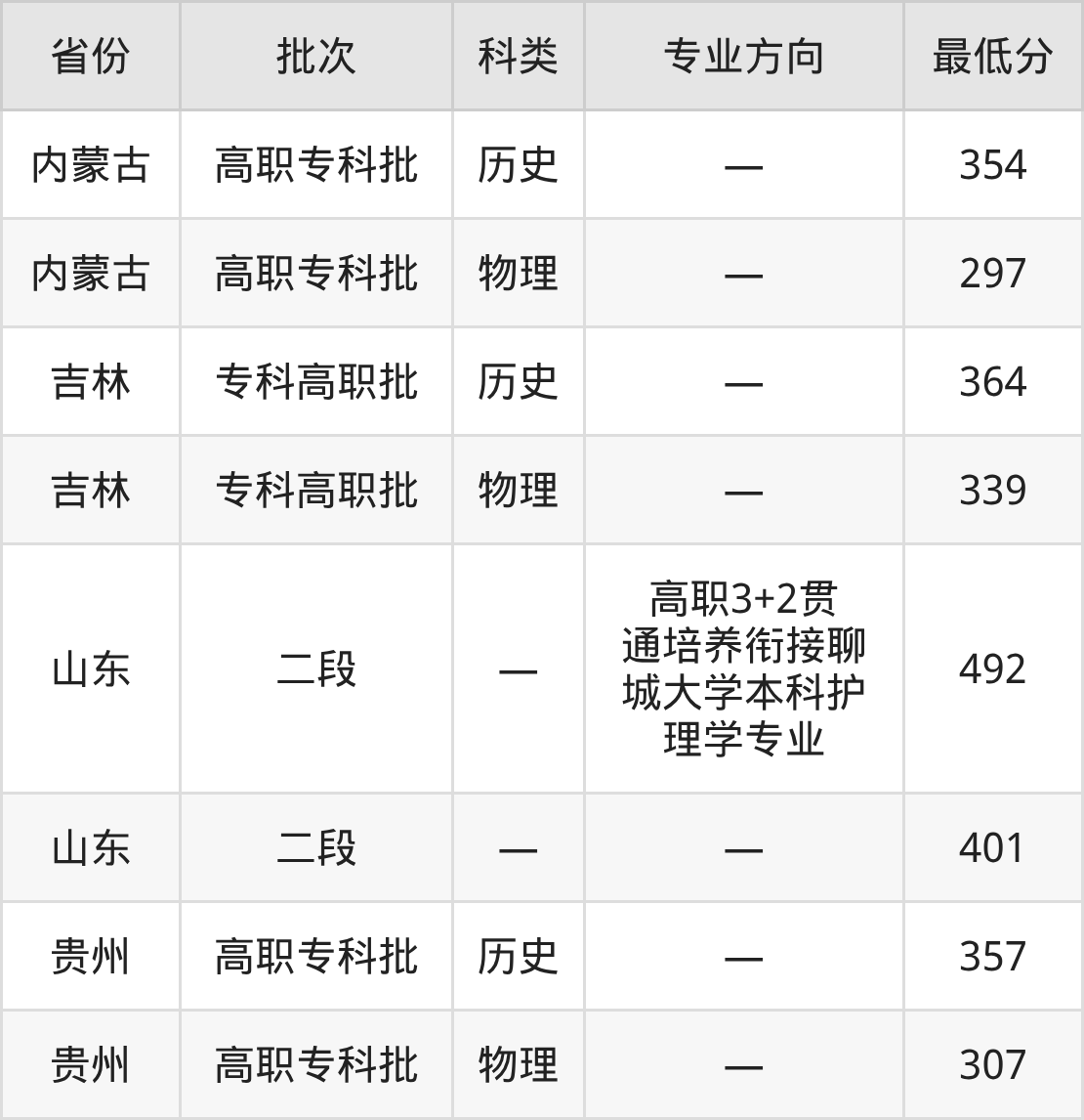 聊城职业技术学院护理专业在全国各省录取分数线: