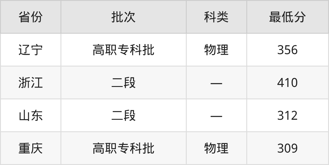 青岛求实职业技术学院中药学专业在全国各省最低录取分数线为309分(重庆物理类),除此之外,在其余地区的最低分为浙江410分、山东312分、辽宁物理类356分,以上数据均为2025年数据,供2026年高考生参考。