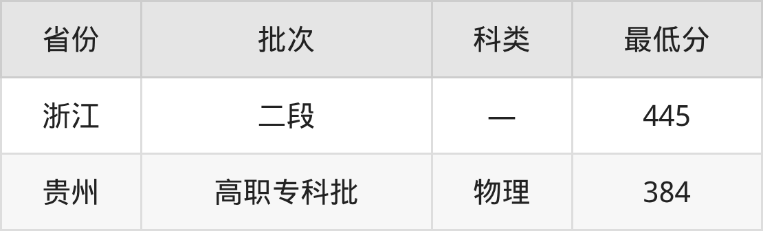 杭州万向职业技术学院机电一体化技术专业在全国各省最低录取分数线为384分(贵州物理类),除此之外,在其余地区的最低分为浙江445分,以上数据均为2025年数据,供2026年高考生参考。