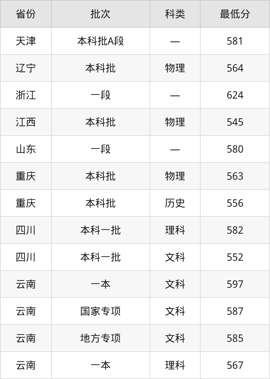 昆明理工大学法学专业录取分数线从545分到624分不等,最低分数线如下: