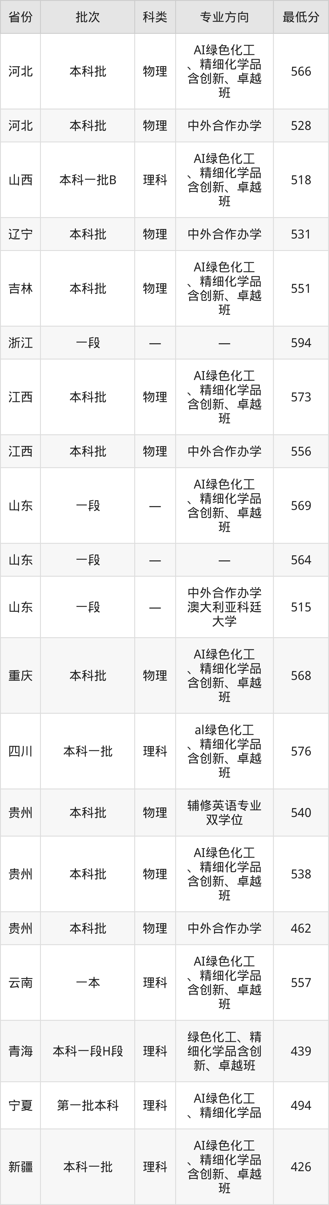 武汉工程大学化学工程与工艺专业录取分数线从426分到594分不等,在部分地区的最低分数线如下: