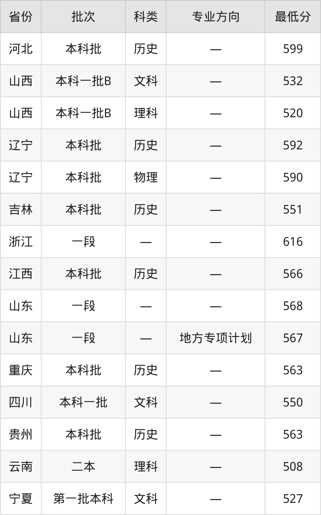 济南大学法学专业录取分数线从508分到616分不等,在部分地区的最低分数线如下: