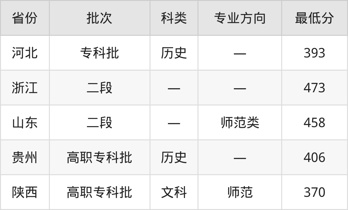 淮南联合大学学前教育专业在全国各省最低录取分数线为370分(陕西文科),除此之外,在其余地区的最低分为浙江473分、山东458分、贵州历史类406分、河北历史类393分,以上数据均为2024年数据,供2025年高考生参考。