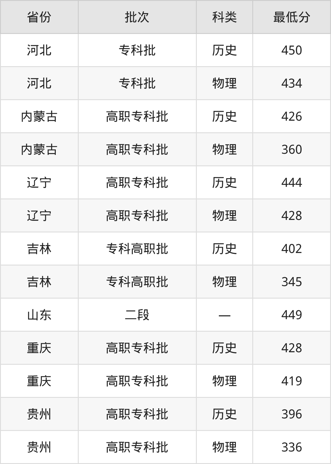 大庆医学高等专科学校护理专业录取分数线从336分到450分不等,最低分数线如下: