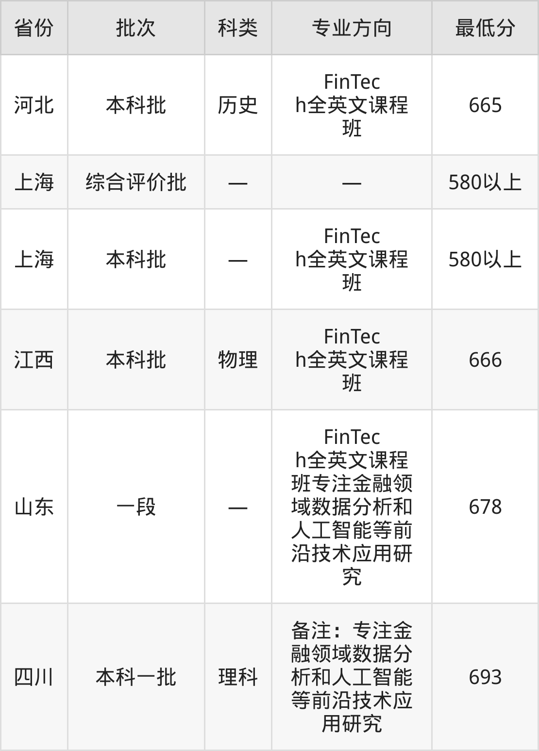 复旦大学金融学专业在全国各省录取分数线: