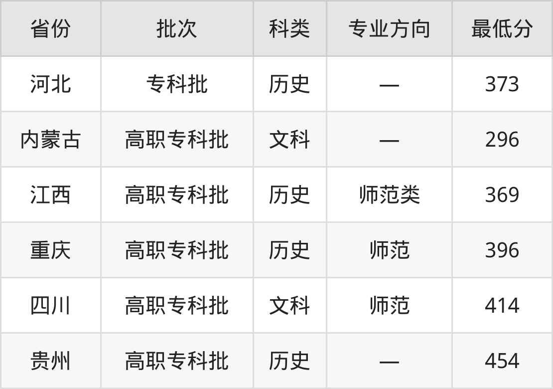 广西幼儿师范高等专科学校小学语文教育专业录取分数线从296分到454分不等,最低分数线如下: