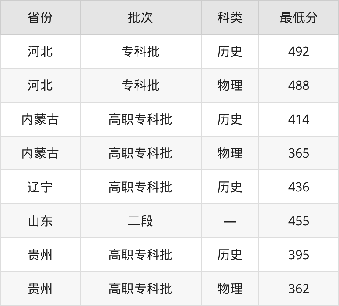 天津现代职业技术学院大数据技术专业录取分数线从362分到492分不等,最低分数线如下: