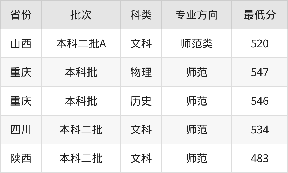 成都师范学院汉语言文学专业录取分数线从483分到547分不等,最低分数线如下: