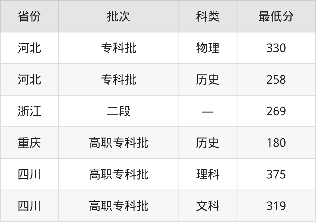 四川托普信息技术职业学院学前教育专业在全国各省最低录取分数线为180分(重庆历史类),除此之外,在其余地区的最低分为浙江269分、四川文科319分、河北历史类258分,以上数据均为2024年数据,供2025年高考生参考。