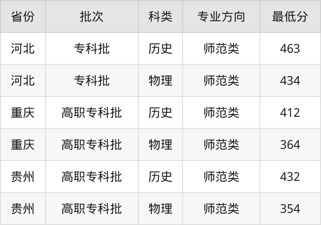 咸阳职业技术学院学前教育专业在全国各省最低录取分数线为354分(贵州物理类),除此之外,在其余地区的最低分为河北物理类434分、重庆物理类364分,以上数据均为2025年数据,供2026年高考生参考。
