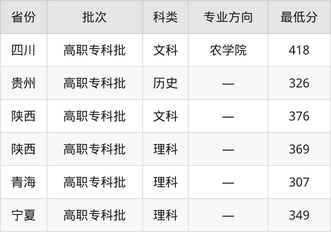 榆林职业技术学院现代农业技术专业录取分数线从307分到418分不等,最低分数线如下: