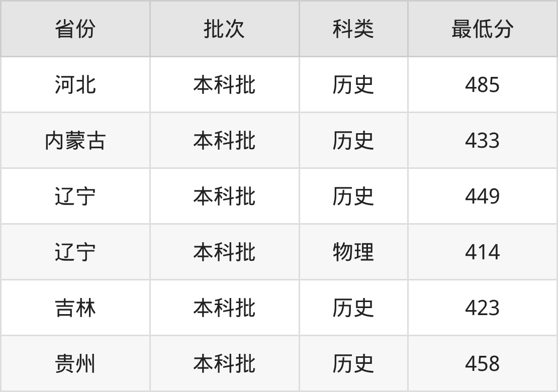 哈尔滨石油学院英语专业在全国各省最低录取分数线为414分(辽宁物理类),除此之外,在其余地区的最低分为河北历史类485分、内蒙古历史类433分、吉林历史类423分、贵州历史类458分,以上数据均为2025年数据,供2026年高考生参考。