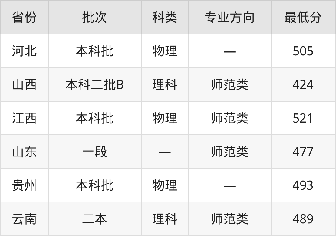 湘南学院物理学专业录取分数线从424分到521分不等,最低分数线如下: