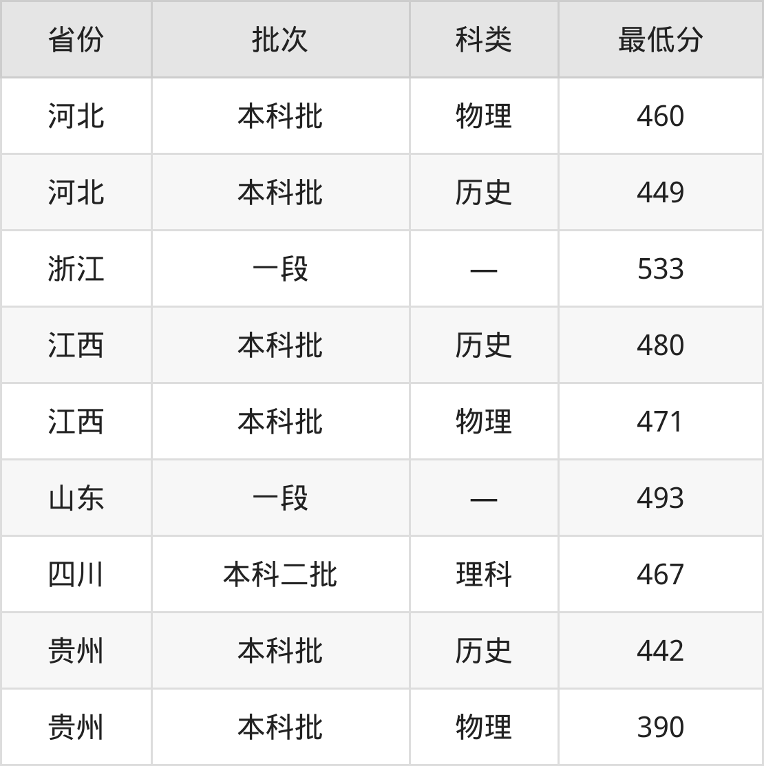 温州商学院金融学专业在全国各省最低录取分数线为390分(贵州物理类),除此之外,在其余地区的最低分为河北历史类449分、浙江533分、江西物理类471分、山东493分等,以上数据均为2024年数据,供2025年高考生参考。