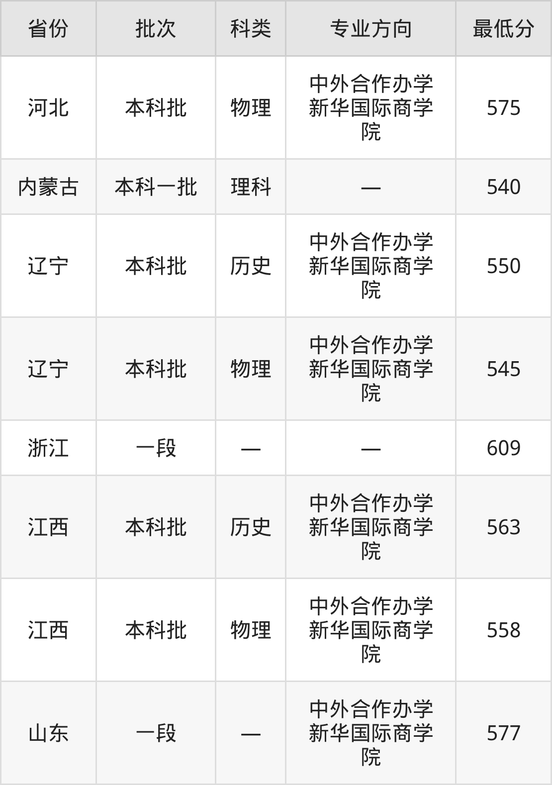 | 历史类 | 中外合作办学 新华国际商学 院 | 5 |
