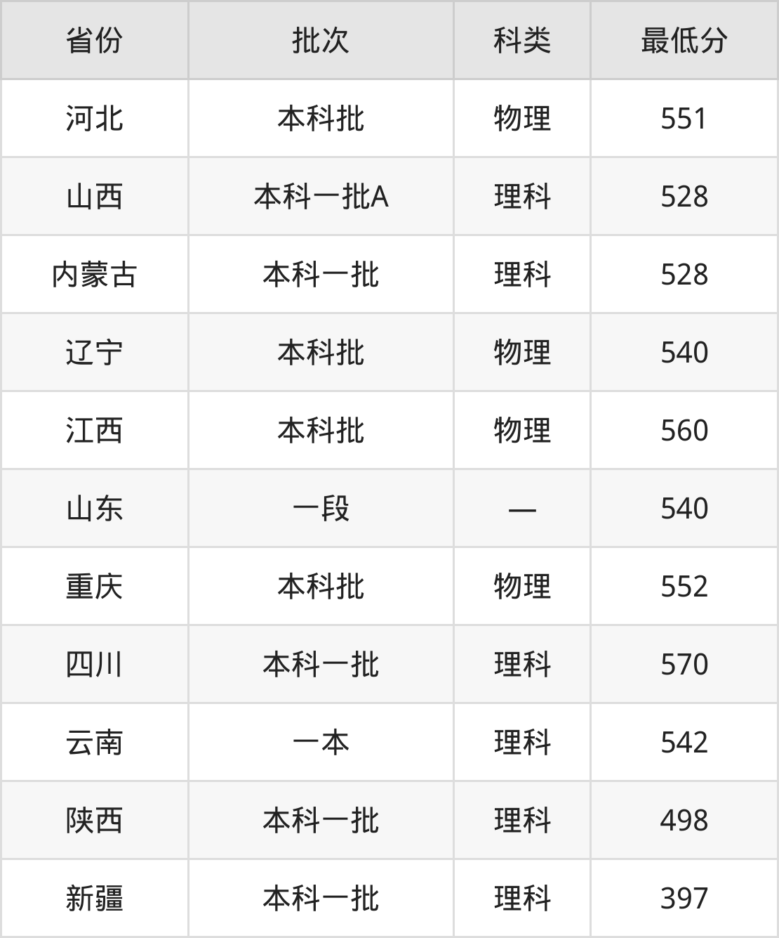 石河子大学给排水科学与工程专业在全国各省录取分数线: