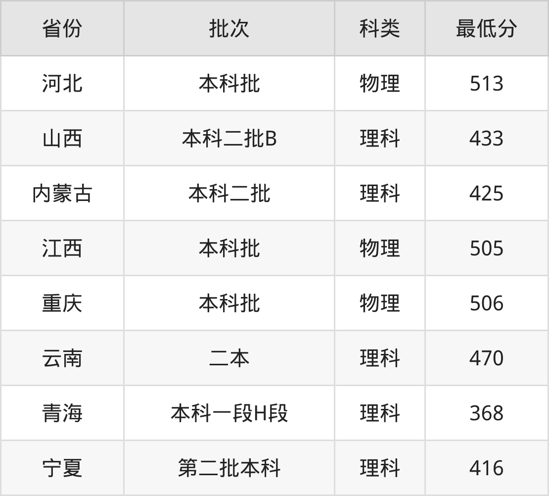 河南工程学院安全工程专业在全国各省最低录取分数线为368分(青海理科),除此之外,在其余地区的最低分为山西理科433分、内蒙古理科425分、江西物理类505分、重庆物理类506分等,以上数据均为2024年数据,供2025年高考生参考。