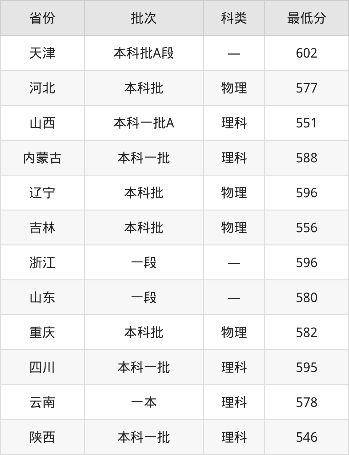 中北大学武器系统与工程专业在全国各省最低录取分数线为546分(陕西理科),除此之外,在其余地区的最低分为重庆物理类582分、天津602分、河北物理类577分、山西理科551分等,以上数据均为2024年数据,供2025年高考生参考。