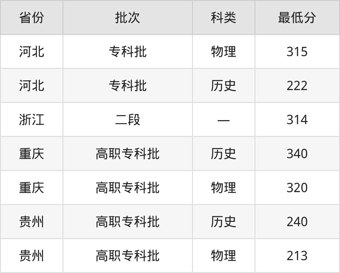 贵州铜仁数据职业学院大数据技术专业在全国各省最低录取分数线为213分(贵州物理类),除此之外,在其余地区的最低分为浙江314分、重庆物理类320分、河北历史类222分,以上数据均为2025年数据,供2026年高考生参考。