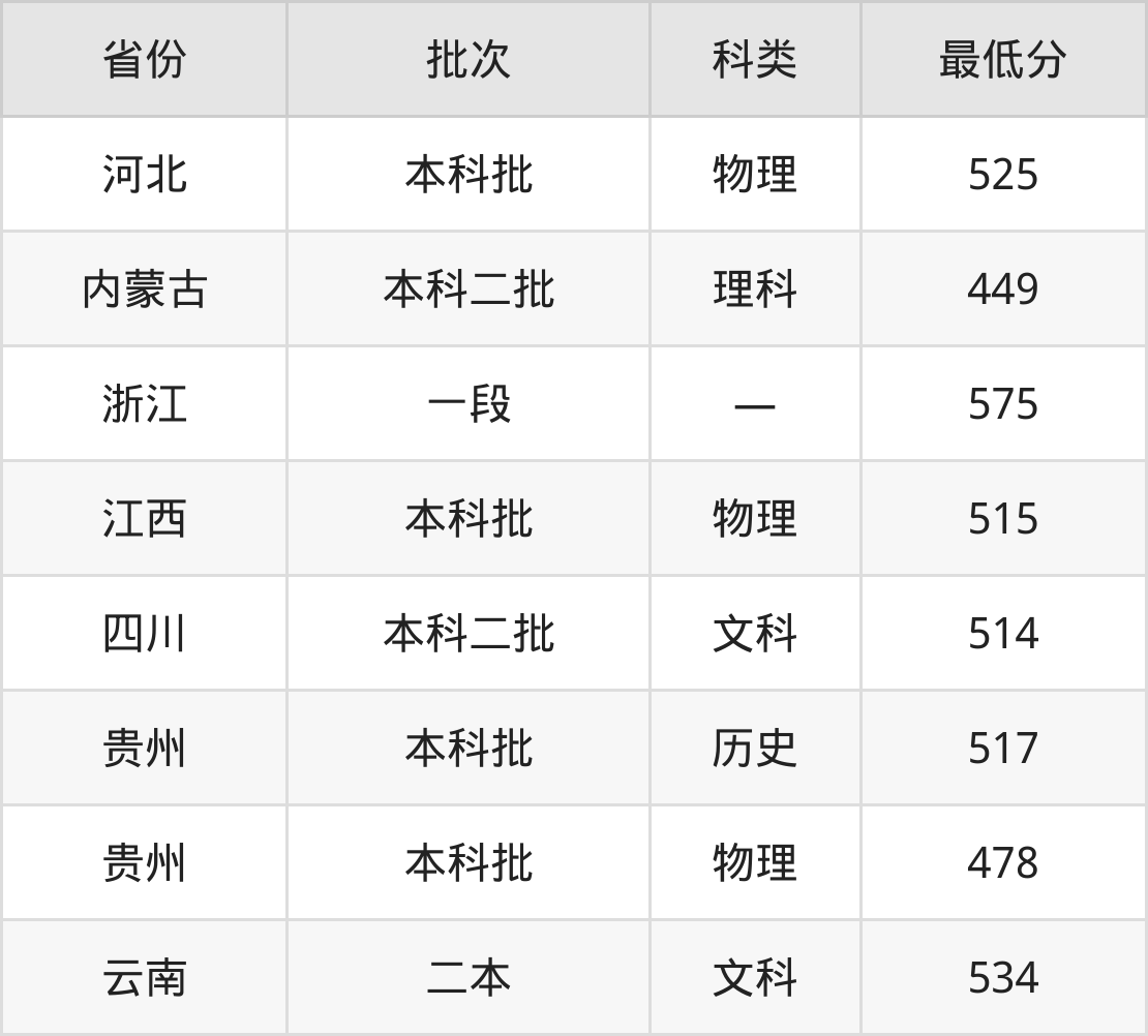 丽水学院财务管理专业在全国各省最低录取分数线为449分(内蒙古理科),除此之外,在其余地区的最低分为云南文科534分、河北物理类525分、浙江575分、江西物理类515分等,以上数据均为2024年数据,供2025年高考生参考。