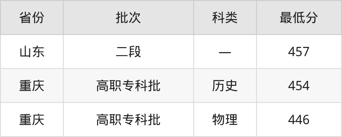 湖北铁道运输职业学院铁道交通运营管理专业在全国各省最低录取分数线为446分(重庆物理类),除此之外,在其余地区的最低分为山东457分,以上数据均为2025年数据,供2026年高考生参考。