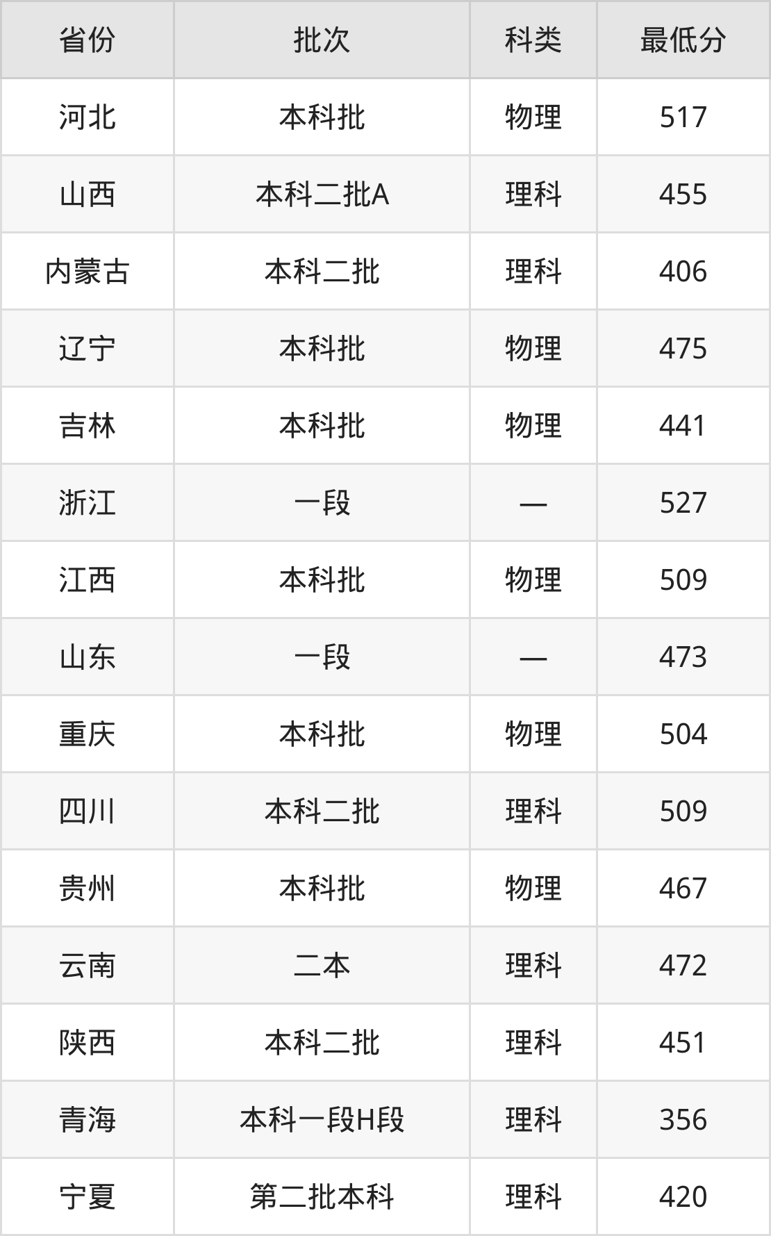 山西工程技术学院物联网工程专业录取分数线从356分到527分不等,在部分地区的最低分数线如下:
