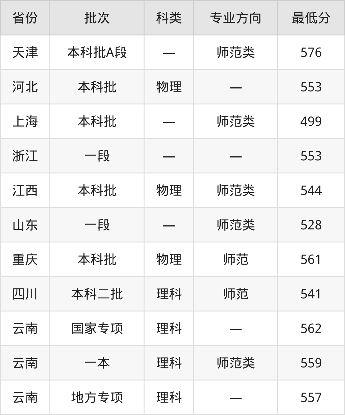 云南师范大学数学与应用数学专业录取分数线从499分到576分不等,最低分数线如下: