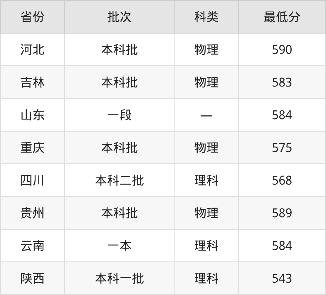西安邮电大学信息对抗技术专业在全国各省最低录取分数线为543分(陕西理科),除此之外,在其余地区的最低分为河北物理类590分、吉林物理类583分、山东584分、重庆物理类575分等,以上数据均为2024年数据,供2025年高考生参考。