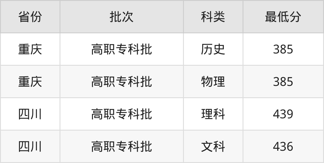 重庆城市职业学院烹饪工艺与营养专业录取分数线从385分到439分不等,最低分数线如下: