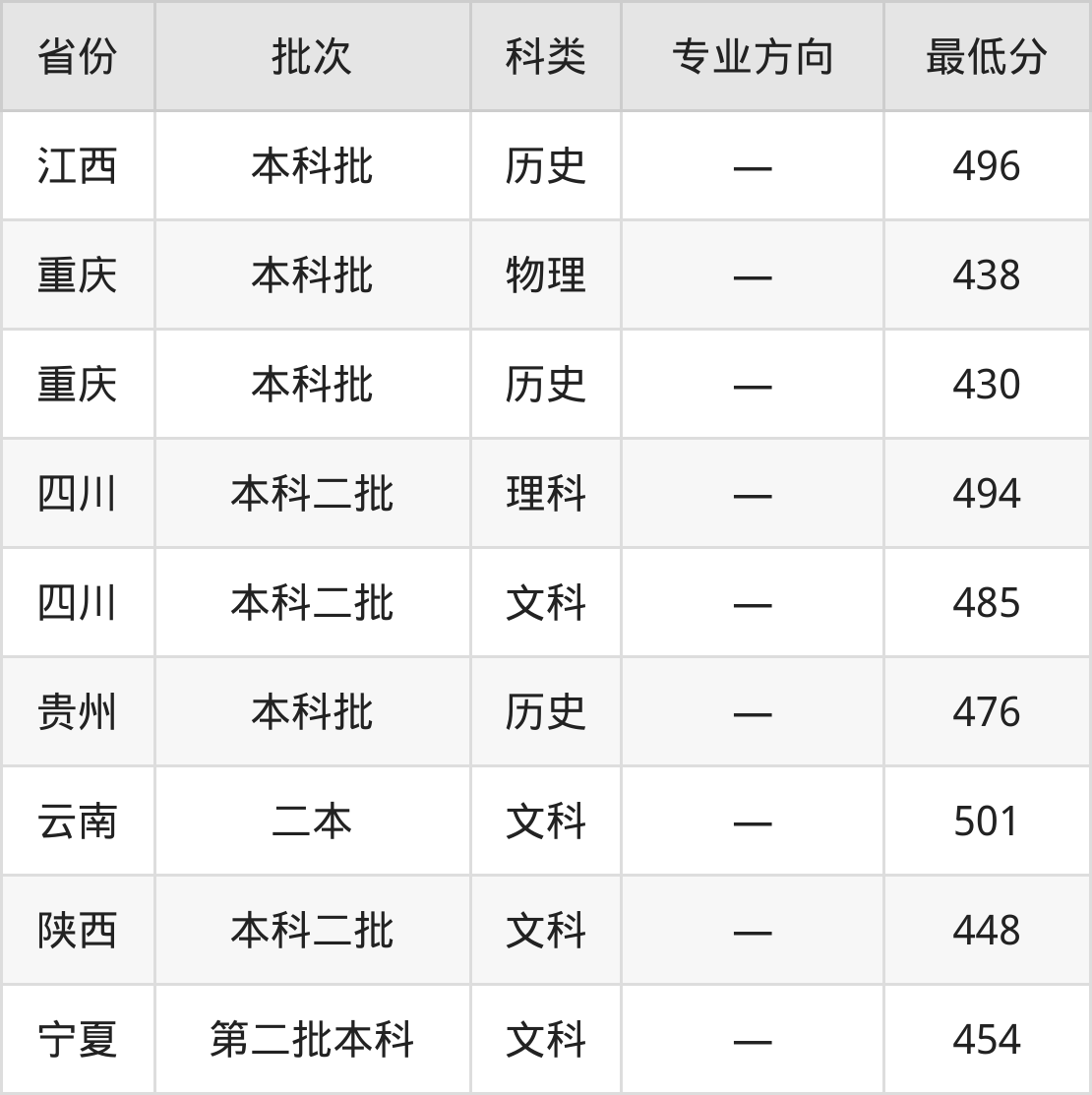 重庆工程学院工商管理类专业在全国各省最低录取分数线为430分(重庆历史类),除此之外,在其余地区的最低分为贵州历史类476分、云南文科501分、陕西文科448分、宁夏文科454分等,以上数据均为2024年数据,供2025年高考生参考。