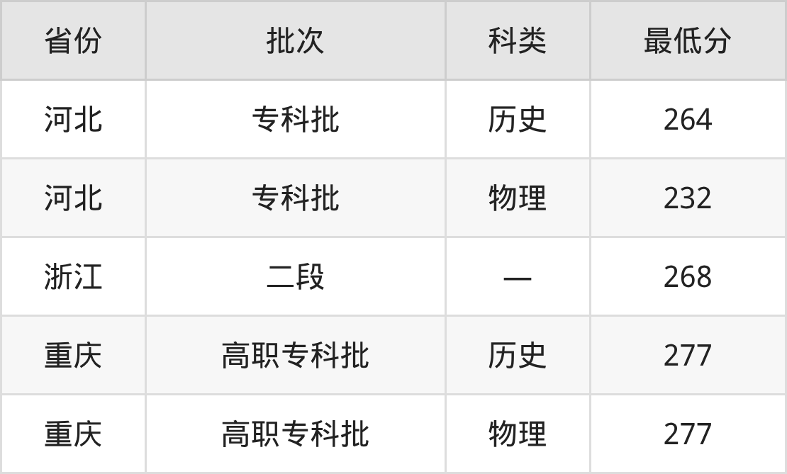 重庆能源职业学院密码技术应用专业录取分数线从232分到277分不等,最低分数线如下:
