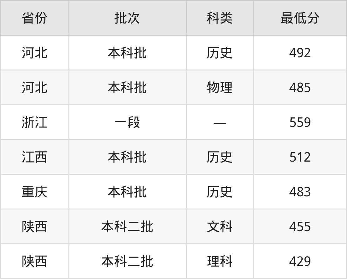 浙江万里学院跨境电子商务专业在全国各省最低录取分数线为429分(陕西理科),除此之外,在其余地区的最低分为河北物理类485分、浙江559分、江西历史类512分、重庆历史类483分等,以上数据均为2024年数据,供2025年高考生参考。