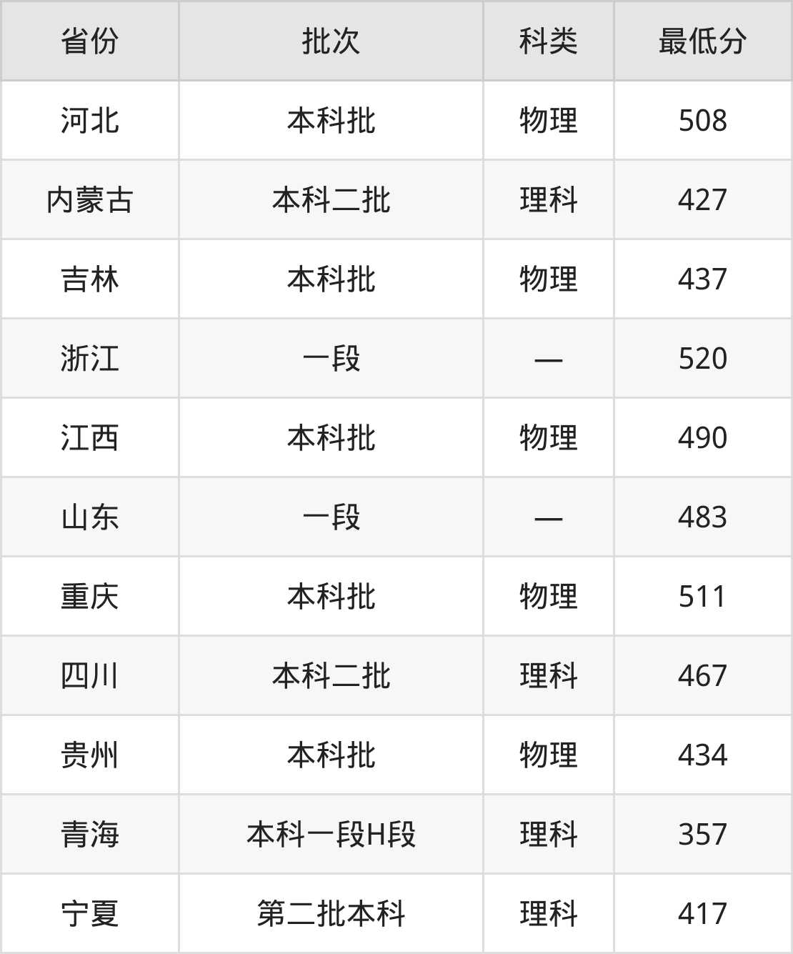 吉林医药学院食品质量与安全专业录取分数线从357分到520分不等,在部分地区的最低分数线如下: