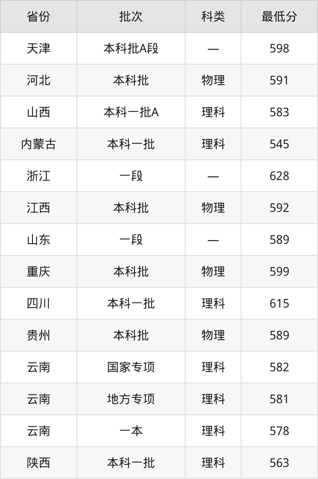 云南大学物理学专业录取分数线从545分到628分不等,在部分地区的最低分数线如下: