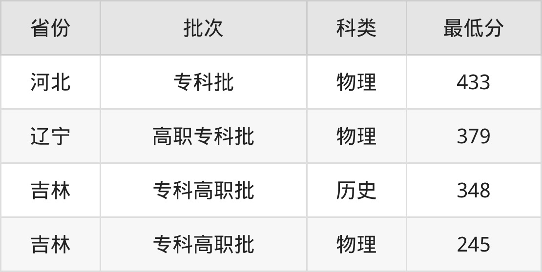 吉林工业职业技术学院石油化工技术专业在全国各省最低录取分数线为245分(吉林物理类),除此之外,在其余地区的最低分为河北物理类433分、辽宁物理类379分,以上数据均为2025年数据,供2026年高考生参考。