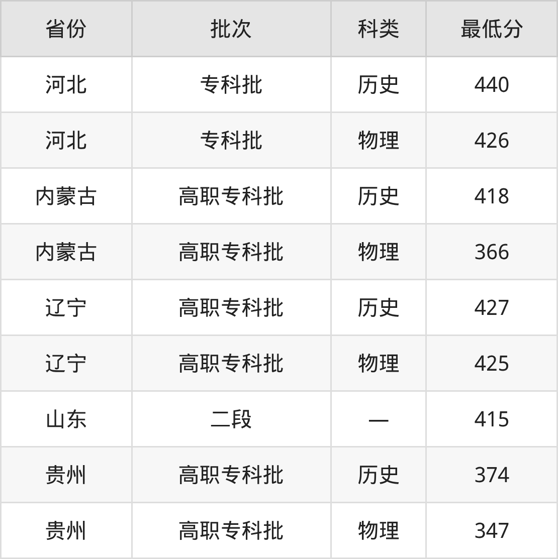 黑龙江护理高等专科学校医学检验技术专业在全国各省最低录取分数线为347分(贵州物理类),除此之外,在其余地区的最低分为河北物理类426分、内蒙古物理类366分、辽宁物理类425分、山东415分等,以上数据均为2025年数据,供2026年高考生参考。