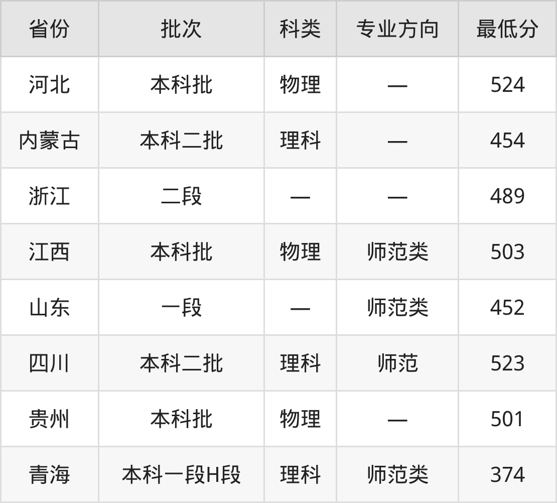 井冈山大学化学专业在全国各省最低录取分数线为374分(青海理科),除此之外,在其余地区的最低分为贵州物理类501分、河北物理类524分、内蒙古理科454分、浙江489分等,以上数据均为2024年数据,供2025年高考生参考。