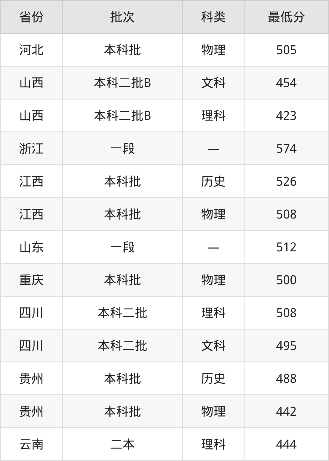 淮阴工学院电子商务专业在全国各省最低录取分数线为423分(山西理科),除此之外,在其余地区的最低分为河北物理类505分、江西物理类508分、四川文科495分、浙江574分等,以上数据均为2024年数据,供2025年高考生参考。