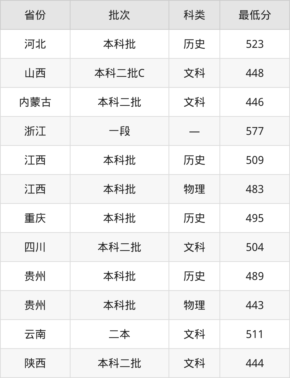 湖北大学知行学院法学专业在全国各省最低录取分数线为443分(贵州物理类),除此之外,在其余地区的最低分为河北历史类523分、山西文科448分、浙江577分、江西物理类483分等,以上数据均为2024年数据,供2025年高考生参考。