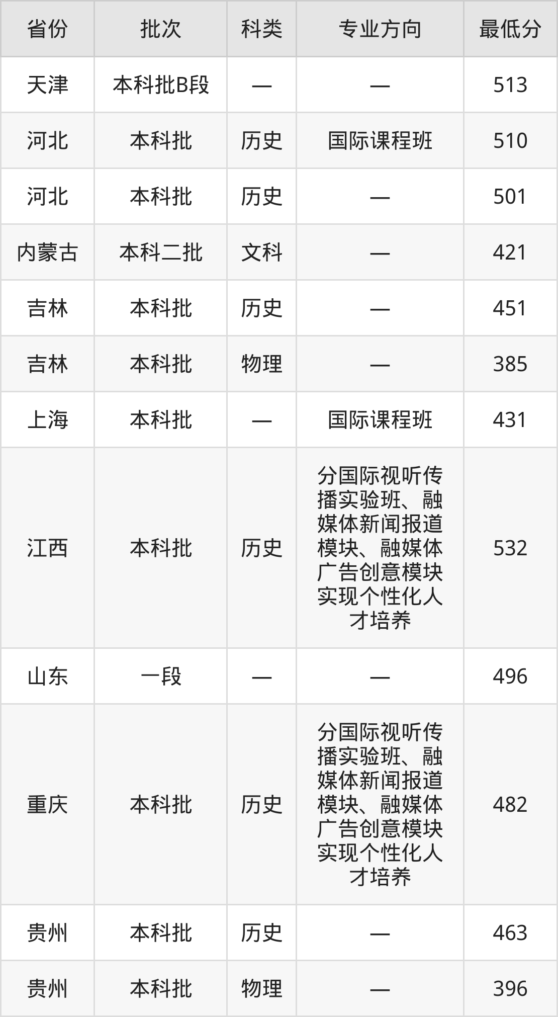 北京城市学院传播学专业录取分数线从385分到532分不等,最低分数线如下: