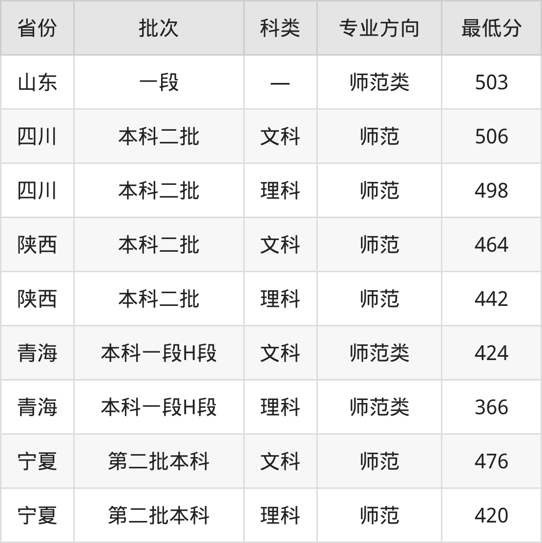 陇南师范学院小学教育专业在全国各省最低录取分数线为366分(青海理科),除此之外,在其余地区的最低分为山东503分、四川理科498分、陕西理科442分、宁夏理科420分,以上数据均为2024年数据,供2025年高考生参考。