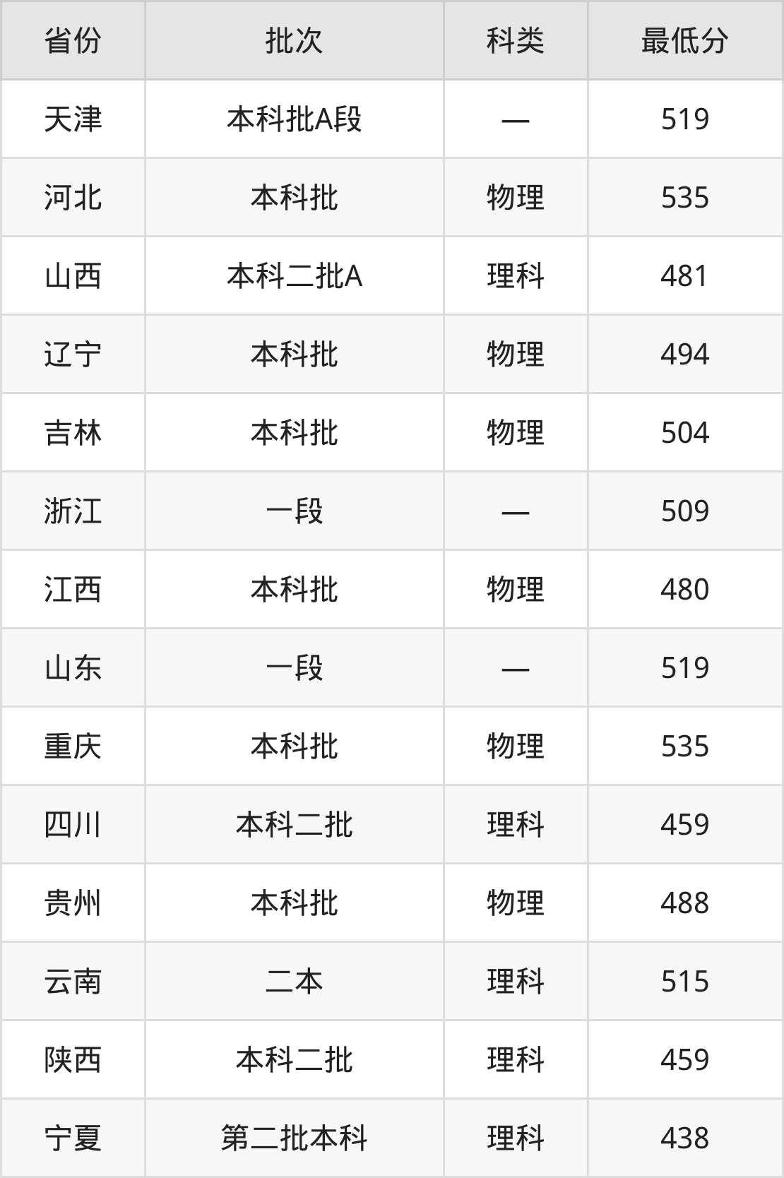 沈阳医学院中药学专业录取分数线从438分到535分不等,在部分地区的最低分数线如下: