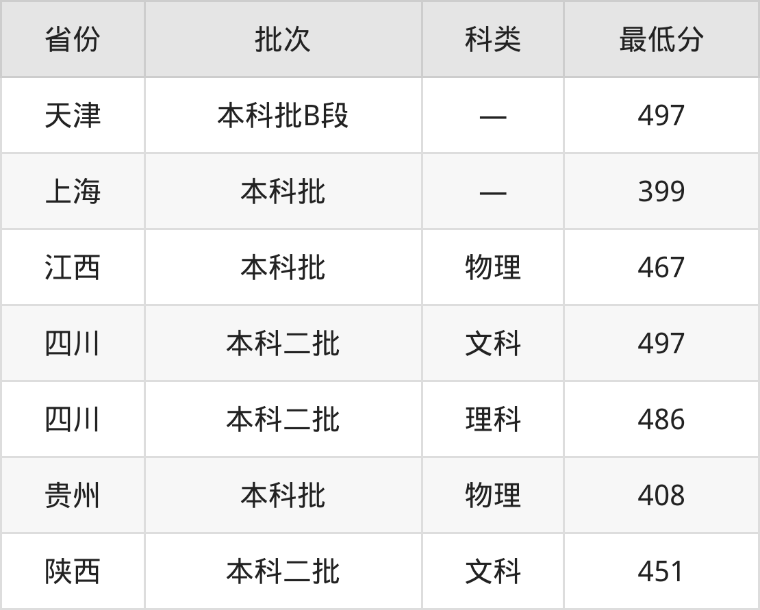江西农业大学南昌商学院金融工程专业在全国各省最低录取分数线为399分(上海),除此之外,在其余地区的最低分为陕西文科451分、天津497分、江西物理类467分、四川理科486分等,以上数据均为2024年数据,供2025年高考生参考。
