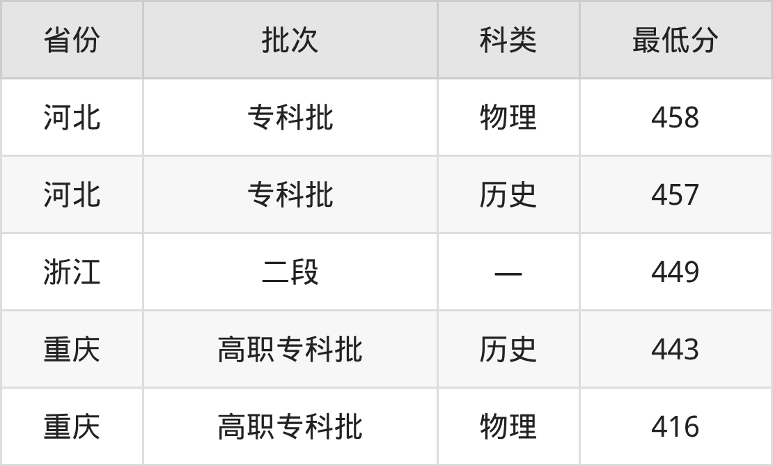 湖北交通职业技术学院新能源汽车技术专业在全国各省最低录取分数线为416分(重庆物理类),除此之外,在其余地区的最低分为河北历史类457分、浙江449分,以上数据均为2025年数据,供2026年高考生参考。
