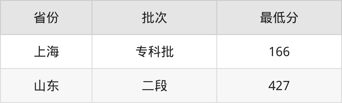 上海旅游高等专科学校餐饮智能管理专业录取分数线从166分到427分不等,最低分数线如下: