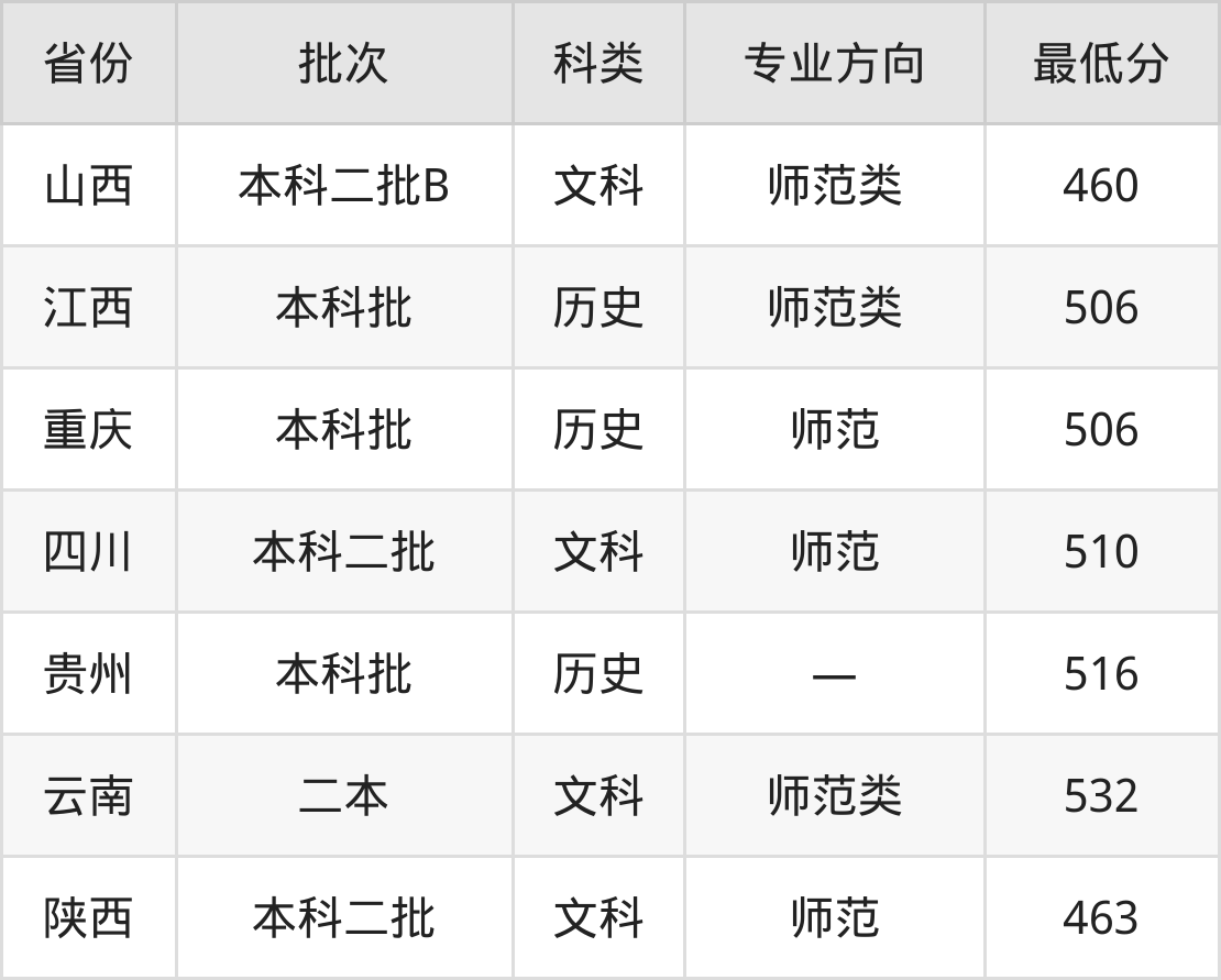 昭通学院汉语言文学专业在全国各省最低录取分数线为460分(山西文科),除此之外,在其余地区的最低分为江西历史类506分、重庆历史类506分、四川文科510分、贵州历史类516分等,以上数据均为2024年数据,供2025年高考生参考。