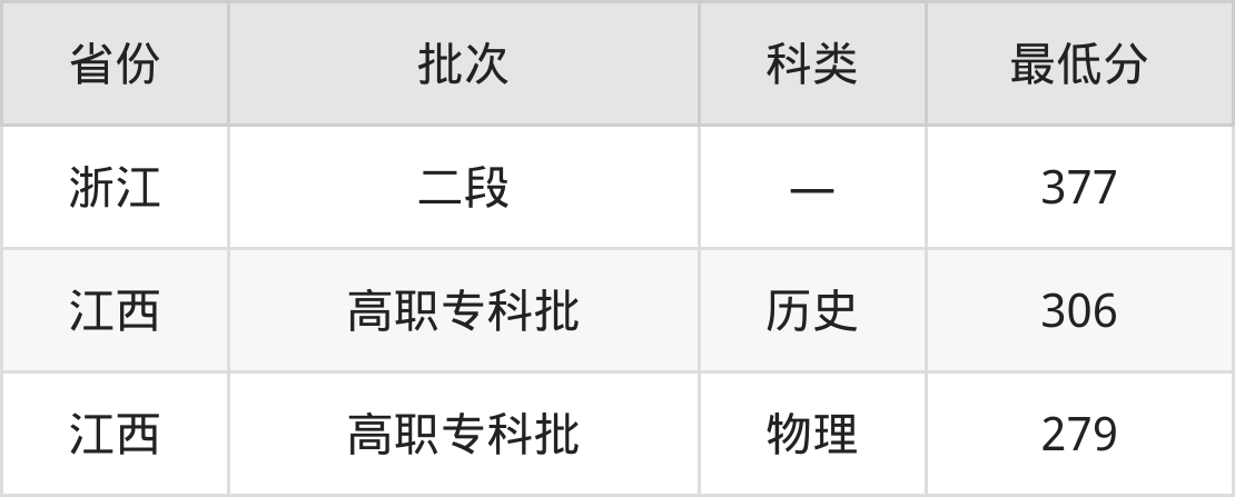 江西科技学院空中乘务专业录取分数线从279分到377分不等,最低分数线如下:
